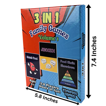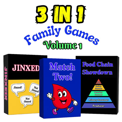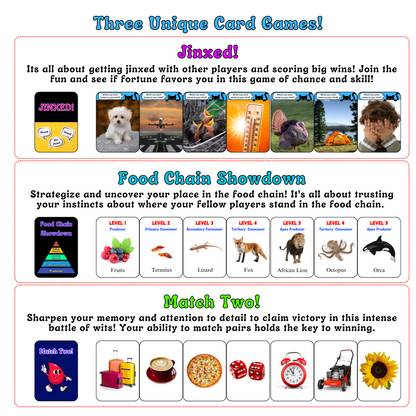 3-in-1 Family Games V1: 1. Get Jinxed with other players to win! 2. Trust your instincts in Food Chain Showdown. 3. Sharpen your memory and win in Match Two’s Battle of Wits!
